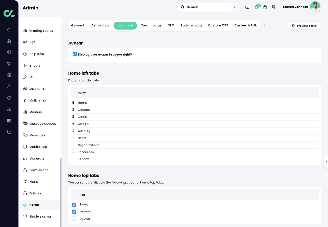 - Home top tabs: enabling or disabling the home top tabs.