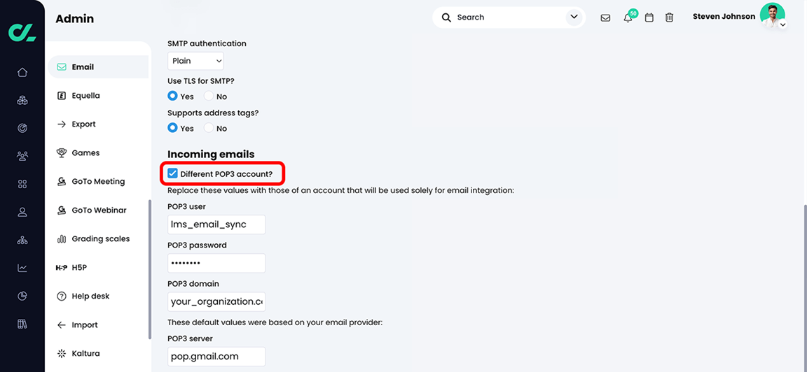 In the Incoming emails section, the Different POP3 account? option is selected by default.