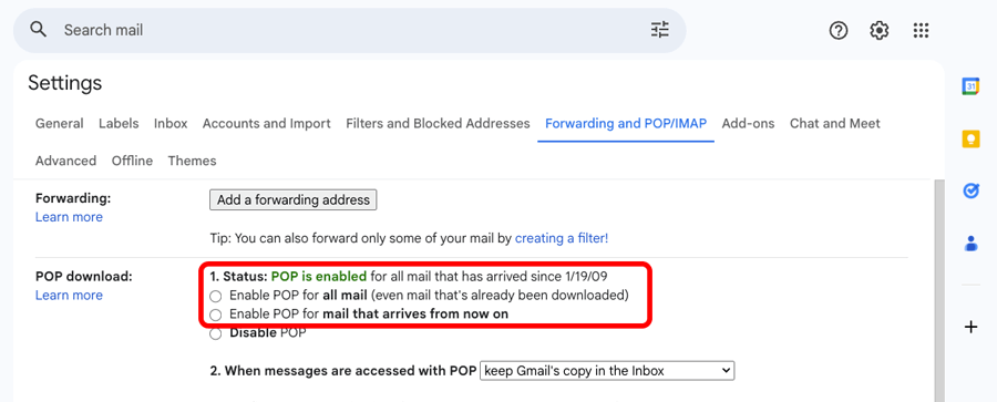 - You can select either Enable POP for all mail or Enable POP for mail that arrives from now on, depending on your preference.