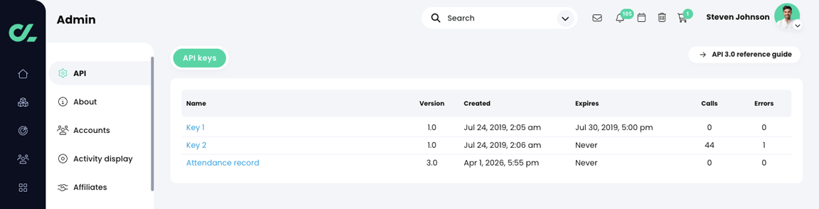 The list of available API keys display, along with their API version number, the date they were created, their expiration date, the number of associated calls, and the number of associated errors.