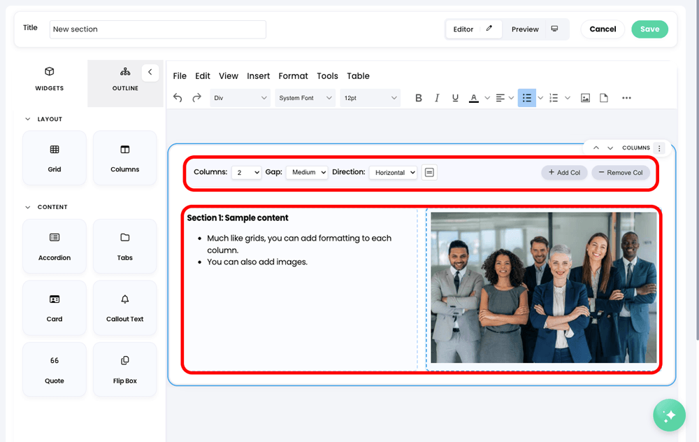 The editor also allows users to format content pages using columns and grids, and to add interactive widgets such as accordions, flip boxes, and more.